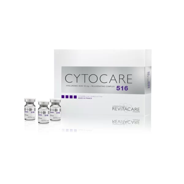 Cytocare 516 is an injectable dermal filler formulated to treat fine lines and wrinkles, rejuvenate dehydrated skin, and add density to improve skin radiance. It is composed of hyaluronic acid and the special Rejuvenating complex CT50. This treatment is a great solution for middle-aged skin, generally for individuals aged between 35 and 50, and is designed to fill in fine lines and wrinkles, stop their progression, hydrate the skin, and provide skin protection.